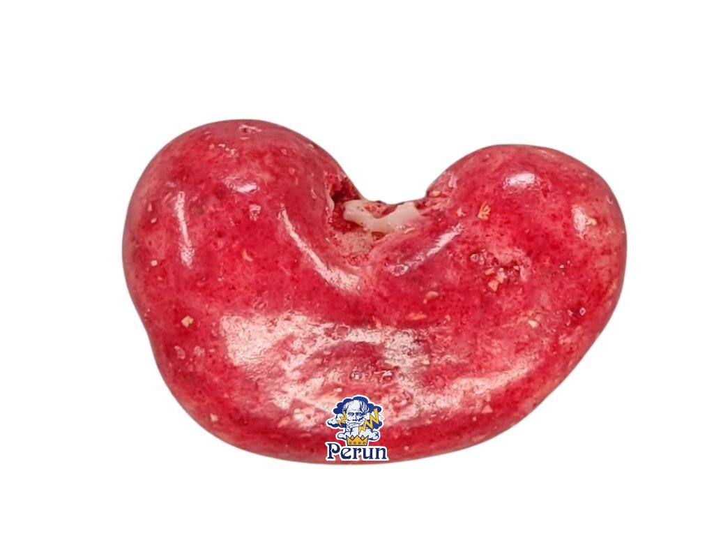 Složení: bílá čokoláda 73% (cukr, kakaové máslo, sušené plnotučné MLÉKO, sušené odstředěné MLÉKO, SOJOVÝ lecitin E 322, přírodní vanilkové aroma), KEŠU jádra 25%, sušené maliny 2%, leštící látka: E 414 (arabská guma).